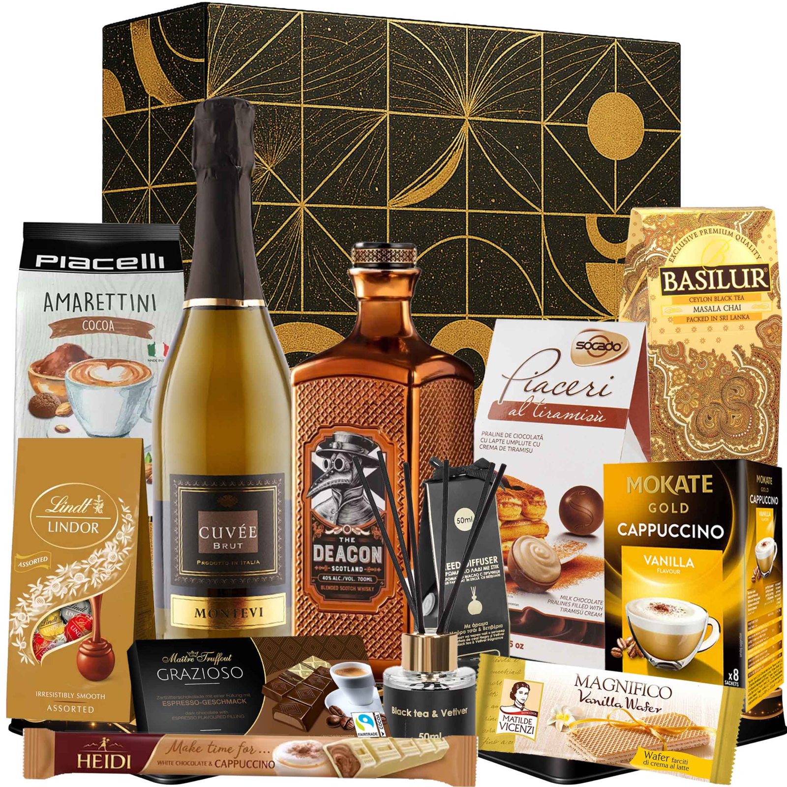 Un cadou exclusivist cu 12 produse premium, având în prim-plan whisky The Deacon, spumant elegant și praline Lindt.