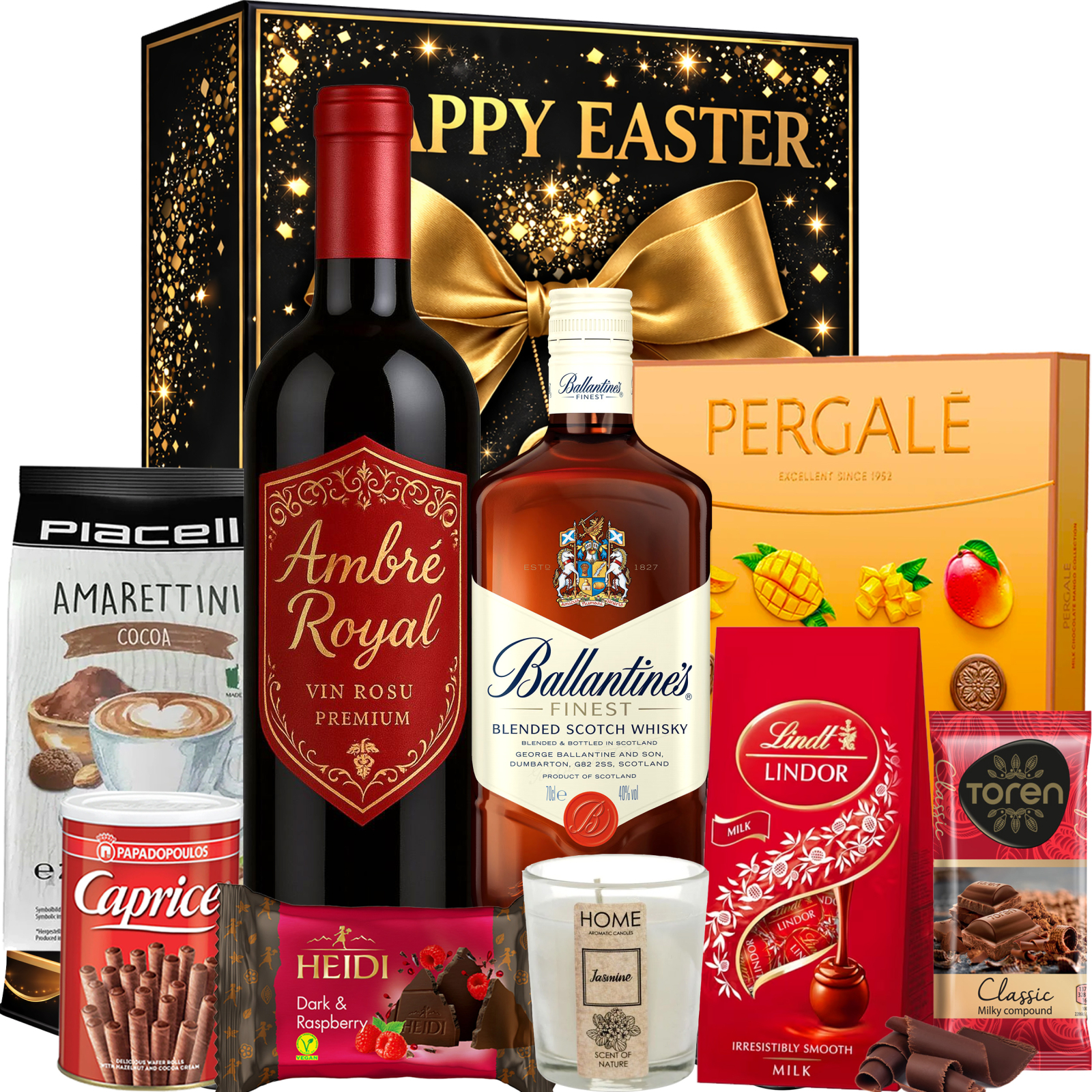 Un cadou exclusivist cu 10 produse premium, de la whisky Ballantine’s și vin roșu Ambre Royal la praline Lindt și ciocolată Pergalė.