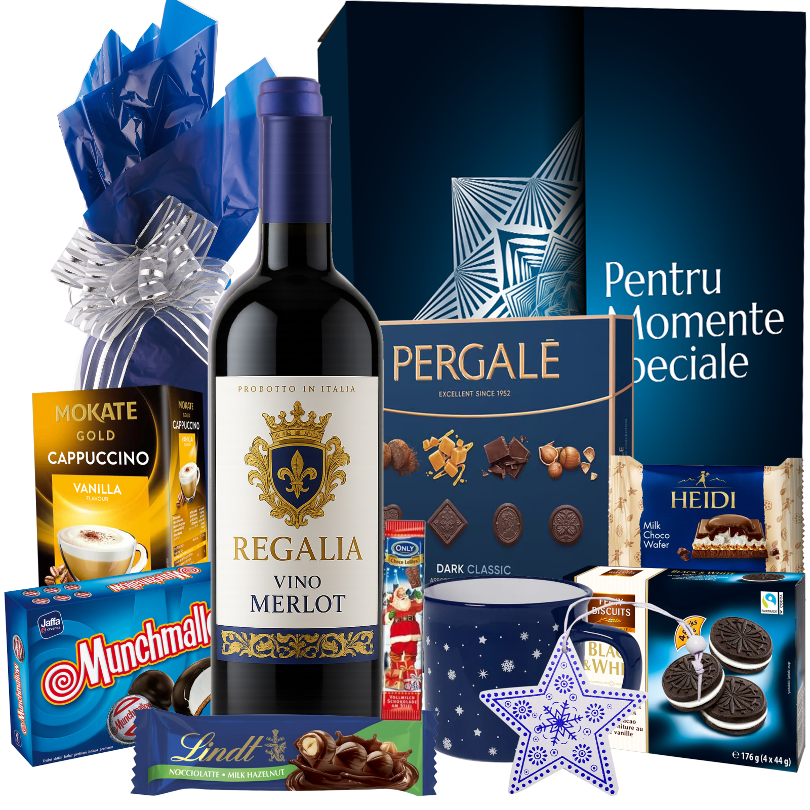 Un cadou festiv cu 12 produse premium, de la vin Regalia și cozonac, la praline fine și cană festivă, expresia rafinamentului de sărbători.
