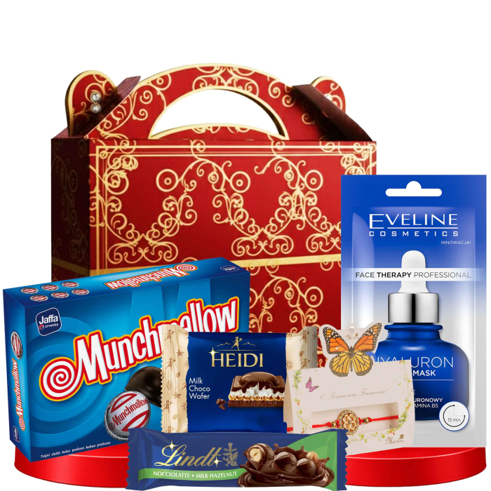 Un cadou elegant care îmbină armonios cosmeticele delicate cu dulciurile fine, oferind un moment de răsfăț și bucurie atent ales pentru orice ocazie specială.