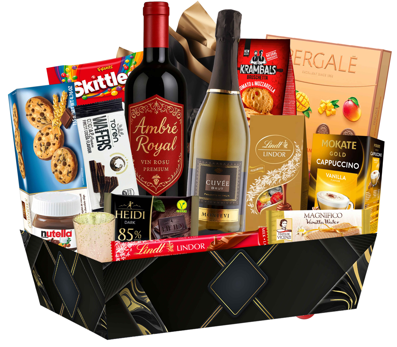 Un cadou complet cu 16 produse atent alese, de la vin roșu și spumant brut, la biscuiți, praline și delicii aromate, completate de un suport elegant pentru lumânare. Perfect pentru a crea un moment festiv, cu gust, stil și surpriză la fiecare detaliu.