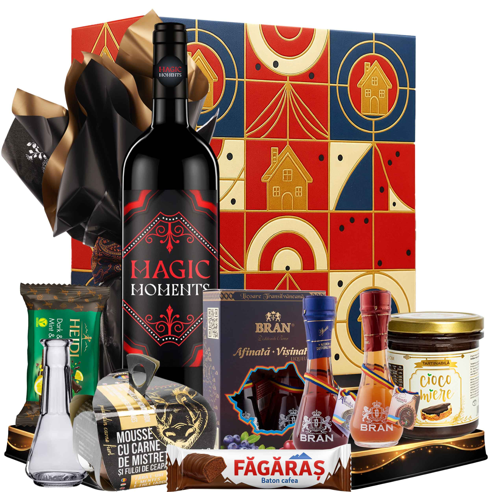 Un cadou autentic românesc cu 8 produse atent selecționate, de la vin roșu Magic Moments și lichioruri tradiționale Bran, până la cozonac pufos, ciocolată fină și specialități gourmet. Cutia cadou Romanian Taste Gift este alegerea perfectă pentru a oferi un cadou cu gust autentic, ideal pentru sărbători, aniversări sau ocazii speciale.