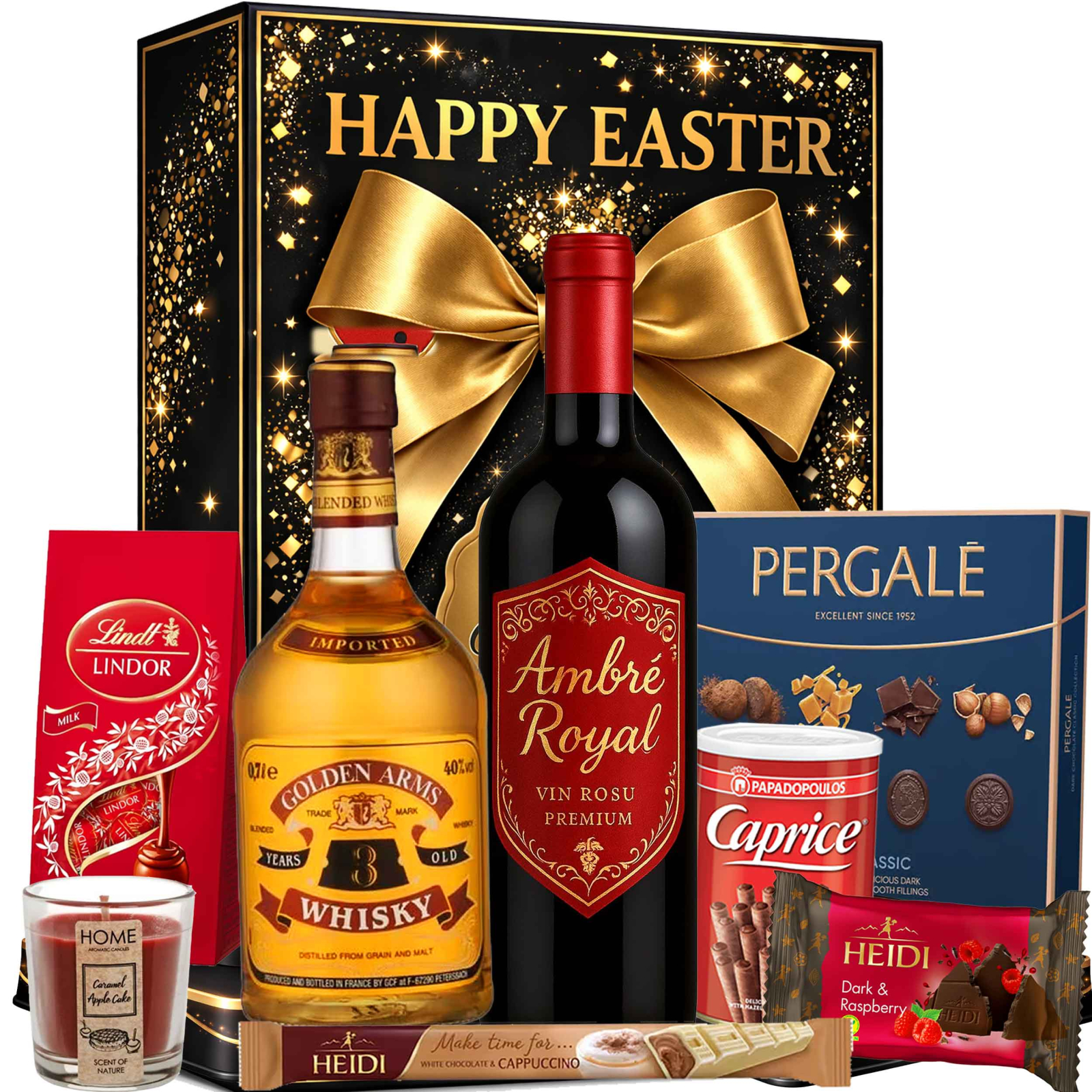 Un cadou rafinat cu 9 produse atent selecționate, de la whisky-ul Golden Arms și vinul roșu Ambre Royal, până la praline fine, ciocolată premium și accente decorative elegante. Cutia cadou Sparkle Gift Box este alegerea ideală pentru a impresiona la sărbători, aniversări sau ocazii speciale.