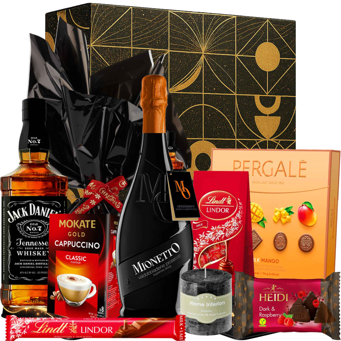 Un cadou rafinat cu 10 produse atent selecționate, de la prosecco-ul Mionetto Treviso D.O.C Brut și whiskey-ul Jack Daniel’s, până la praline fine, panettone aromat, cappuccino cremos și accente decorative elegante. Cutia cadou Dark Flame este alegerea perfectă pentru a impresiona la sărbători, aniversări sau în mediul business.