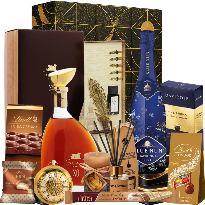 Cutie Cadou Deau XO Luxe este un cadou exclusivist creat pentru a impresiona prin eleganță, rafinament și selecția premium de produse. Combinația dintre cognacul Deau XO, spumantul rafinat Blue Nun, dulciurile fine și accesoriile elegante transformă acest set într-o alegere ideală pentru cadouri business, aniversări sau ocazii speciale.