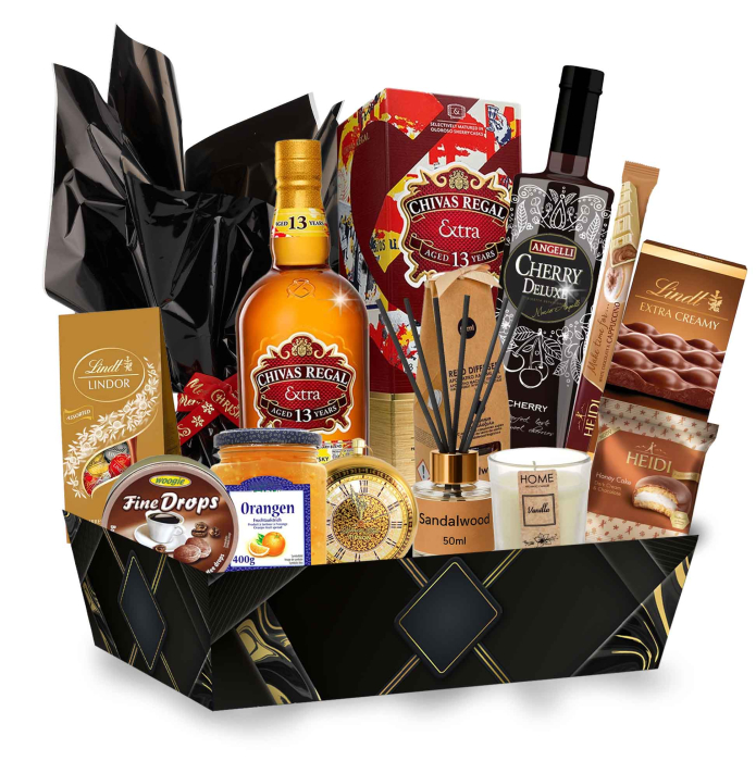 Un cadou sofisticat cu produse atent selecționate, de la whisky-ul premium Chivas Regal și lichiorul Angelli Cherry Deluxe, până la panettone aromat, praline fine, ceai premium și delicii dulci rafinate. Cutia cadou Deluxe Cherry este alegerea perfectă pentru a impresiona cu stil la sărbători, aniversări sau ocazii speciale.