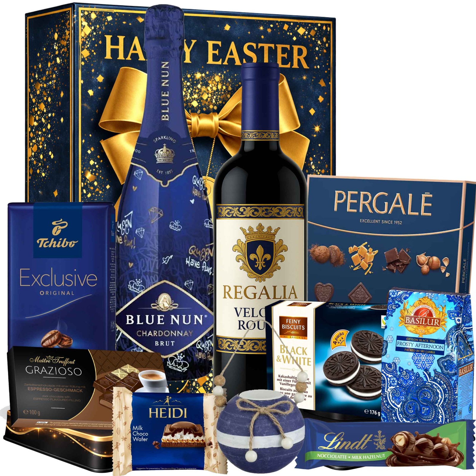 Un cadou rafinat cu 10 produse atent selecționate, de la spumantul Blue Nun Queen Edition și vinul roșu Regalia, până la ceai premium, cafea aromată, ciocolată fină și accesorii decorative elegante. Cutia cadou Grand Regalia este alegerea ideală pentru a impresiona cu stil la sărbători, aniversări sau ocazii speciale.