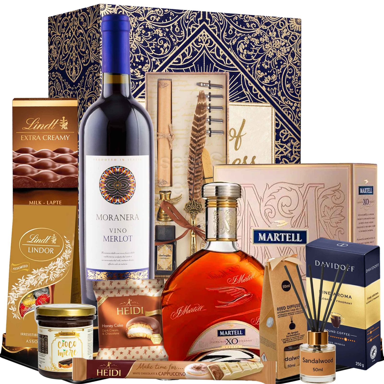 Un cadou rafinat cu 11 produse atent selecționate, de la cognacul premium Martell XO și vinul roșu Merlot Moranera, până la cafea Davidoff, praline Lindt și delicii dulci elegante. Cutia cadou Luxe Affair este alegerea ideală pentru a impresiona cu stil la evenimente speciale, aniversări sau cadouri corporate de lux.